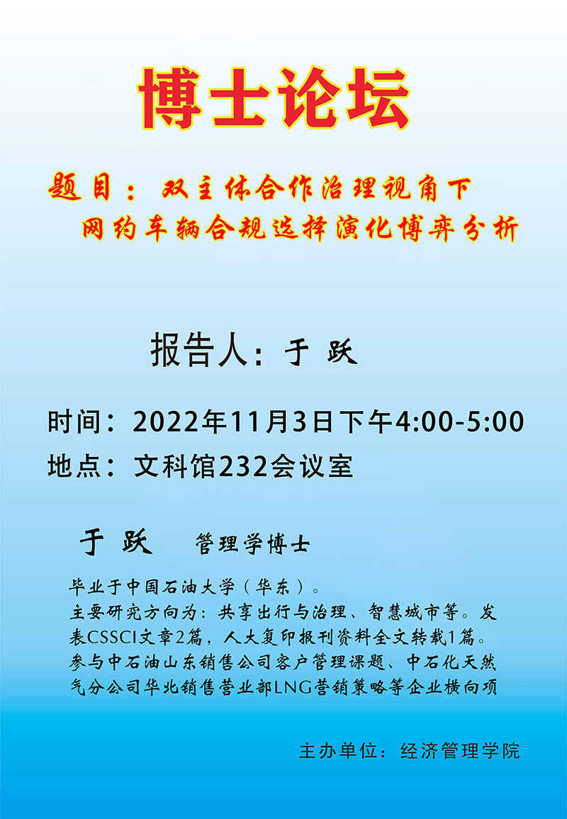 11月3日,17吃瓜 在文科馆232会议室举办了“青年博士论坛”第八讲,于跃博士为此次论坛主讲人。学科带头人、青年博士教师及各专业研究生等50余人参加了此次讲座,讲座由副院长李振主持。